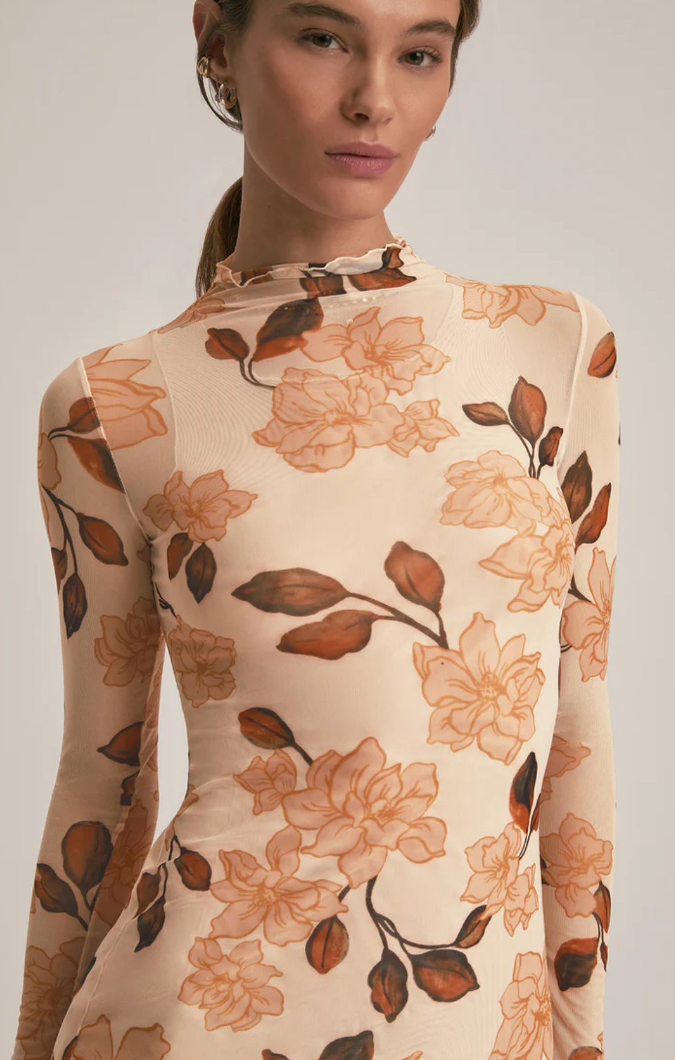 The Sheer Fantasy Dress fits close to the body in a soft, lightweight mesh. Designed in our Bare Roses print with a mock neckline and full lining, it’s floral, fitted, and totally unforgettable. Measures 56" from shoulder to hem.
