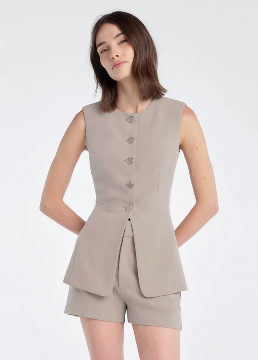 The Clocking In Top is a long-line vest with a crew neckline, exposed buttons, and a fitted waist that flares ever so slightly. it's cut from a structured suiting blend and looks especially chic when paired with The Favorite Mini Short.