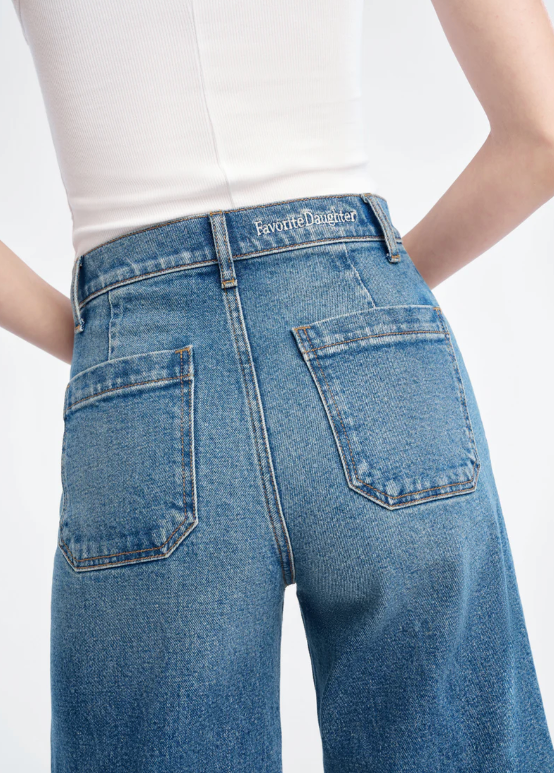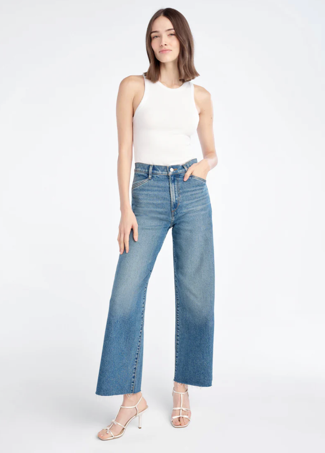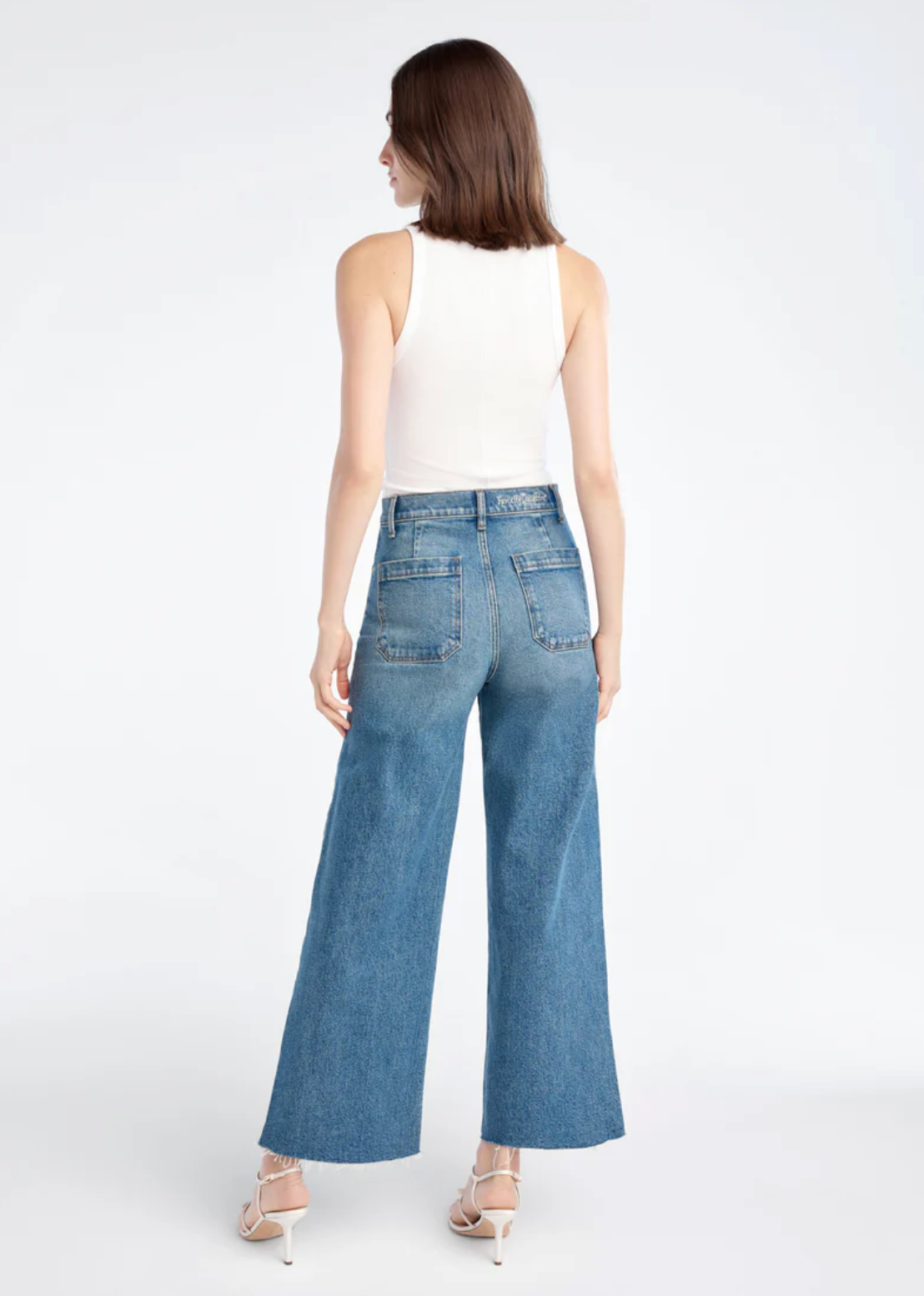 A super high-rise, wide-leg jean that's pinched at the waist, easy at the hips and hits at the ankle. Features a cut wide hem, front slant pockets, back patch pockets and darts for a flattering fit.